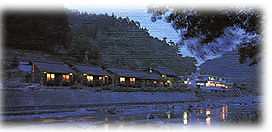 | 5時を過ぎ、あたりは暗くなる。途中、余りの寒さに何もないが、広い場所で小休止!マフラーの熱で暖をとる・・・少し手のかじかみが落ち着いたので再び出発しする。不安になりつつも、右側の川の向こうに今宵の宿、馬路温泉らしきものを見つけたときにはホッとする。 そして、向こう岸に渡るための橋を見つけ、橋を渡る。道路に入る曲道、少し向こうから車が来ていたので曲がろうか、止まろうか迷った。止まろうと思った瞬間、バランスを崩し、悲しき立ちゴケ(T^T) とりあえず、端にバイクを止め走れるように直す。いつものとおりウィンカーの割れと、ギアのねじれと、クラッチレバーの曲がり。みんなに悪いなぁと思うが、みんな嫌な顔ひとつせず、直してくれる。 なんとか走れるように応急処置をし、走り出す。やはり、先ほど見た場所が馬路温泉で、まもなくたどり着いた。真っ暗になるまえにたどり着けてよかった。時間はちょうど6時。ショートカットしてよかったと思った。 私たちはバンガロを2棟借りていた。バンガロまでは、温泉のあるフロントから、つり橋をわたっていかないといけない。温泉に入っても冷えるよねなどといいつつバンガロに向かった。このつり橋が揺れる、揺れる。降りた後も頭が揺れていた。男性7人が10人部屋女性4人が4人部屋のつもりで借りていたが、人数が減ったのと、10人の棟が思った以上に広く、部屋も分かれていたため、1棟にまとめることにした。残念ながら、キャンセルはきかないとのことだったが、寒くなって部屋に戻るのも嫌だったので、1棟分の鍵を返すことにした。