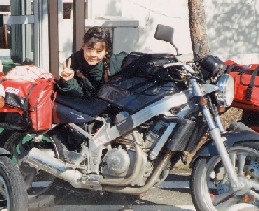 初めての晴れ!今日は写真、撮りまくりだぞ <4月1日> 10時半頃、美香ちゃんから電話があり走れるとのこと。美香ちゃんを待つ間、野村さんと佐多岬の灯台へ行った。結構暑くて汗ばむほど。宿舎へ戻り、2時頃、美香ちゃんも元気な姿で到着した。 さっそく北上し、霧島へと向かう。途中、桜島の横を通った時、降り散る灰で野村さんと私は目が痛くなりたまらずにバイクを止めた。ひとり美香ちゃんは平気な顔をしていた。 |
